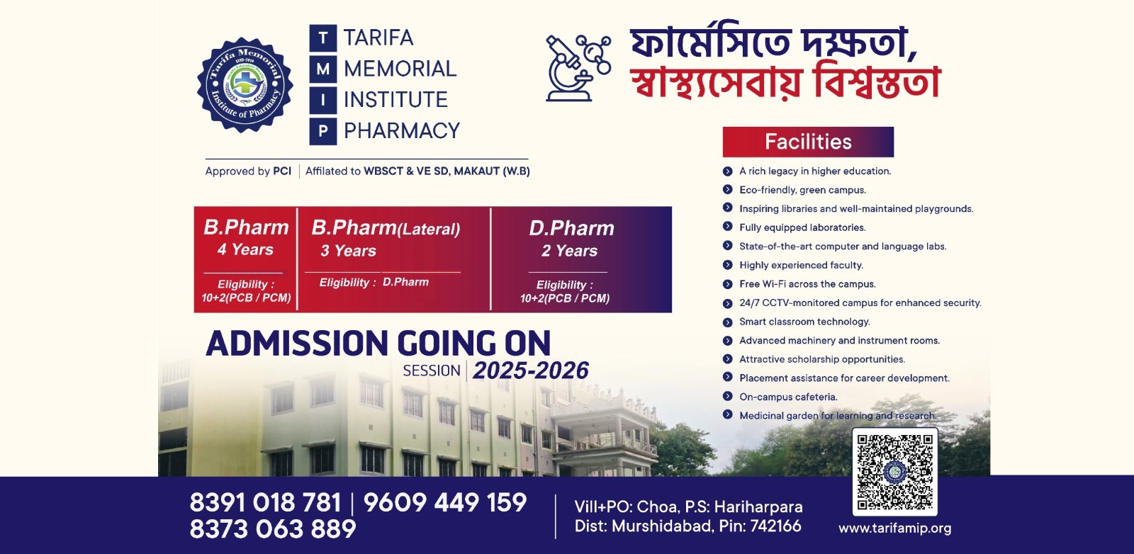 TARIFA MEMORIAL INSTITUTE OF PHARMACY is the pioneer institution conducting Pharmacy courses in the State of West Bengal. It is an independent, co-educational and self financed institution offering Diploma, program.