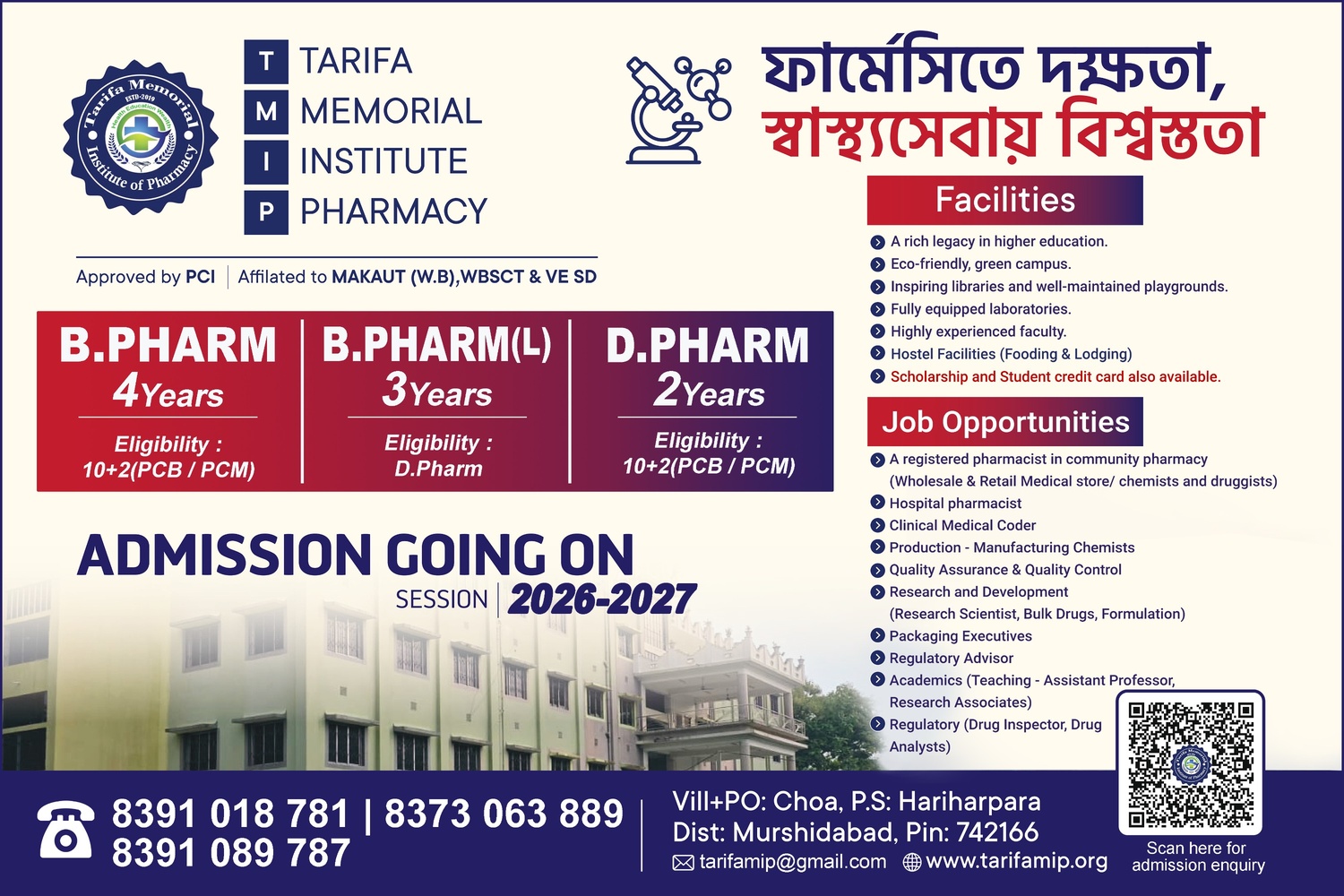 TARIFA MEMORIAL INSTITUTE OF PHARMACY is the pioneer institution conducting Pharmacy courses in the State of West Bengal. It is an independent, co-educational and self financed institution offering Diploma, program.